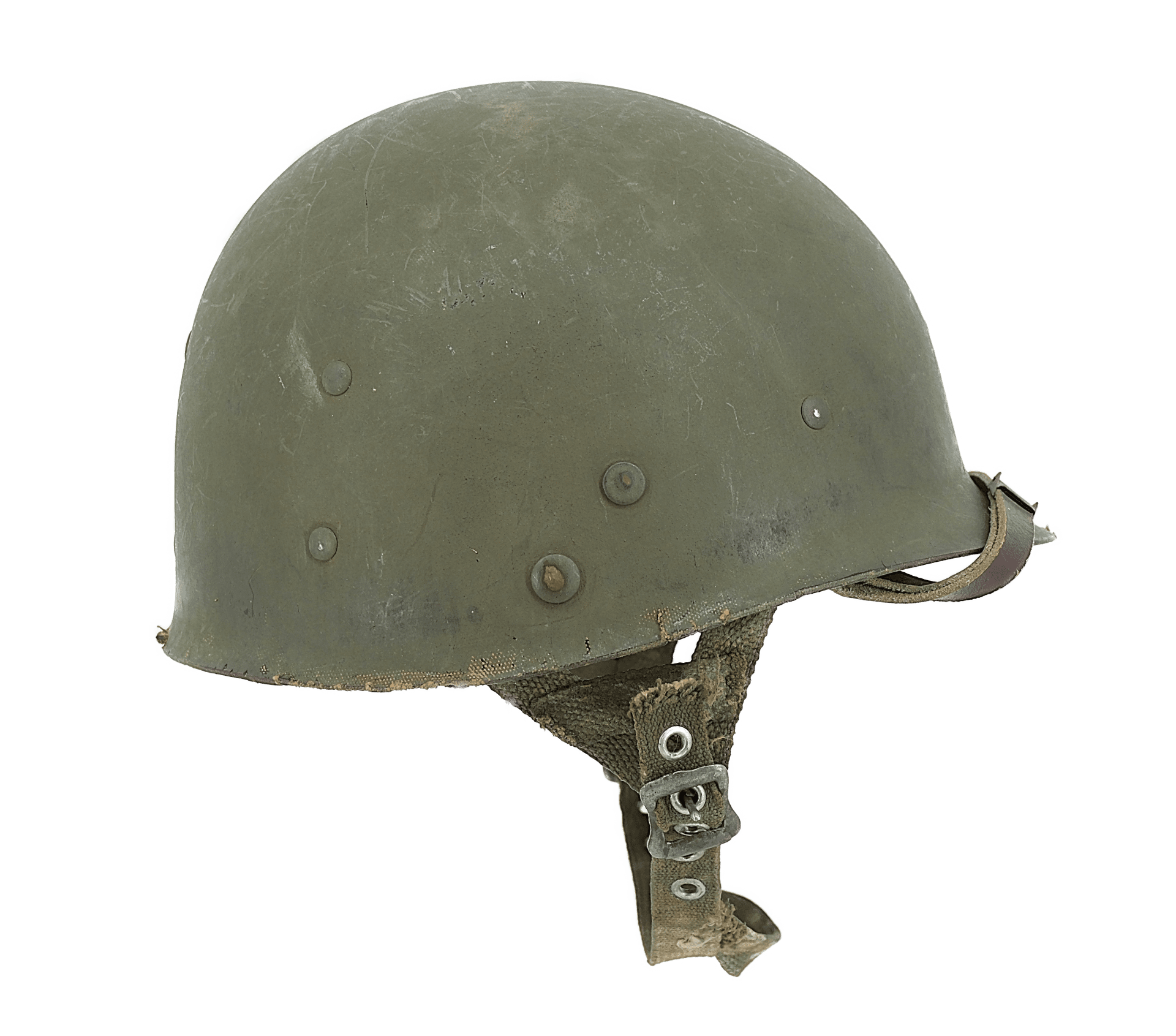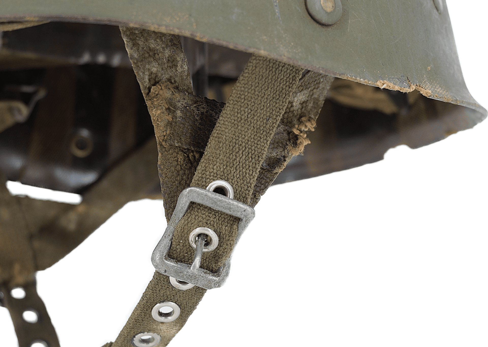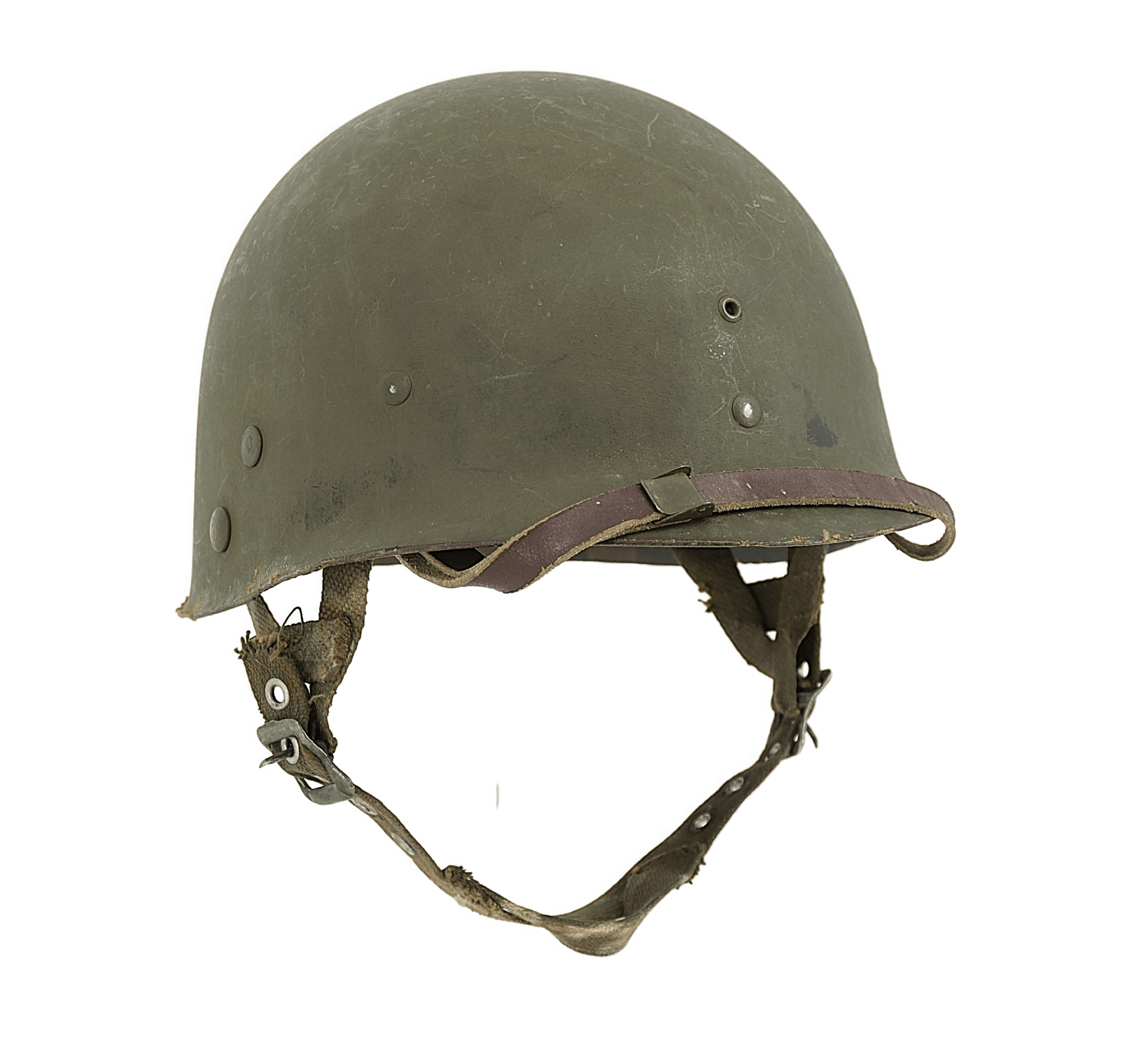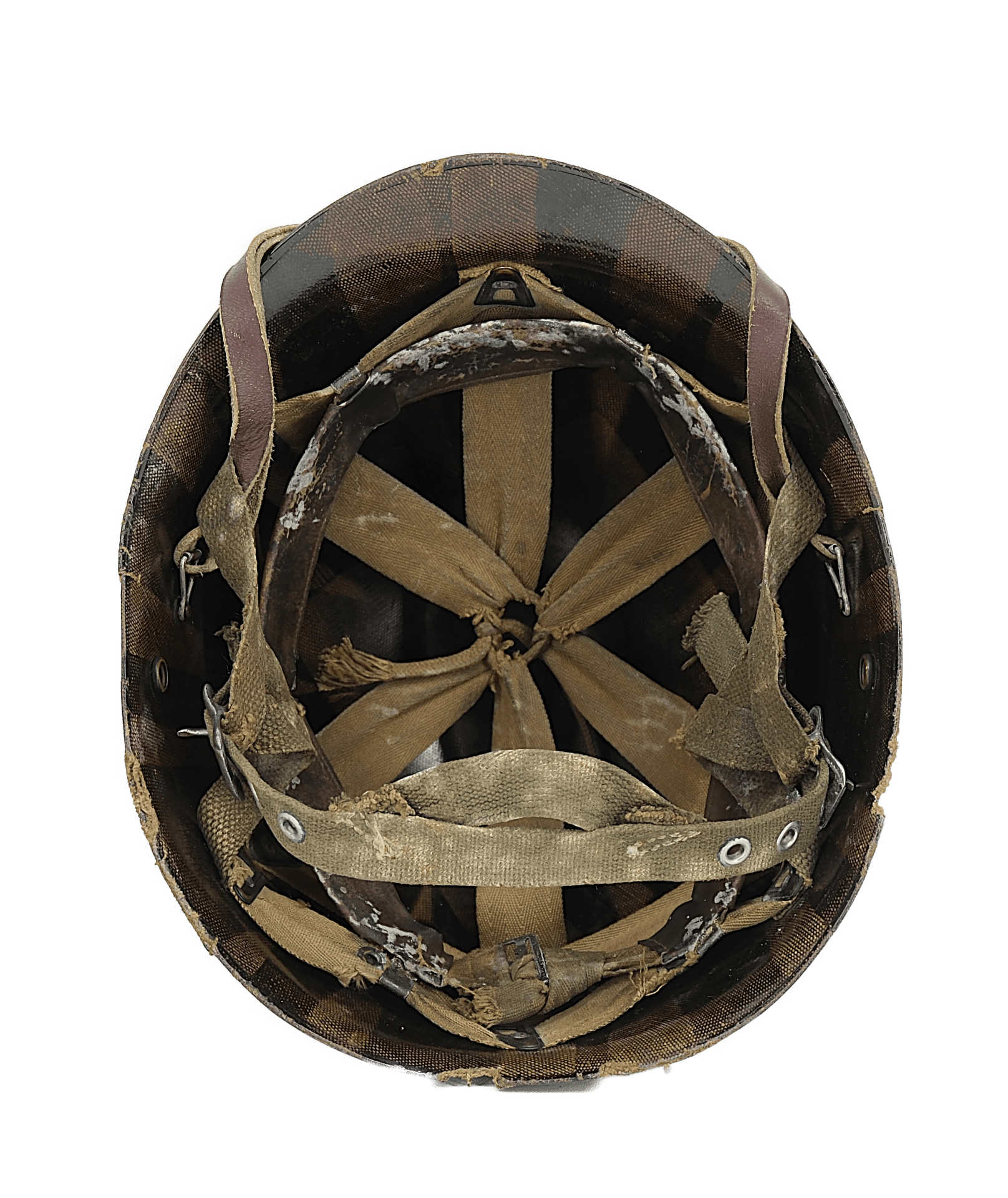 Intérieur en toile et cuir et boutons pressions pour fixation du casque lourd présent.